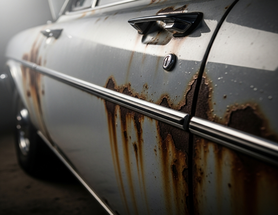 A ferrugem forma-se quando o metal entra em contacto prolongado com humidade e oxigénio. Se a pintura ou o verniz estiverem danificados, o aço da carroçaria fica exposto, iniciando o processo de oxidação.